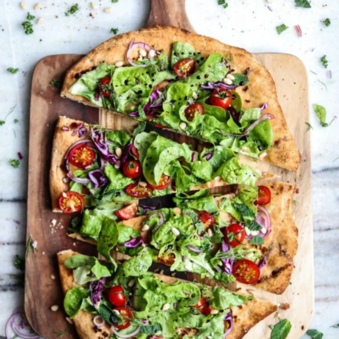 This recipe begins with a gourmet crunchy pizza dough, rolled out and cooked with olive oil and garlic. Topped with freshly tossed bib lettuce, herbs, and a bright vinaigrette.